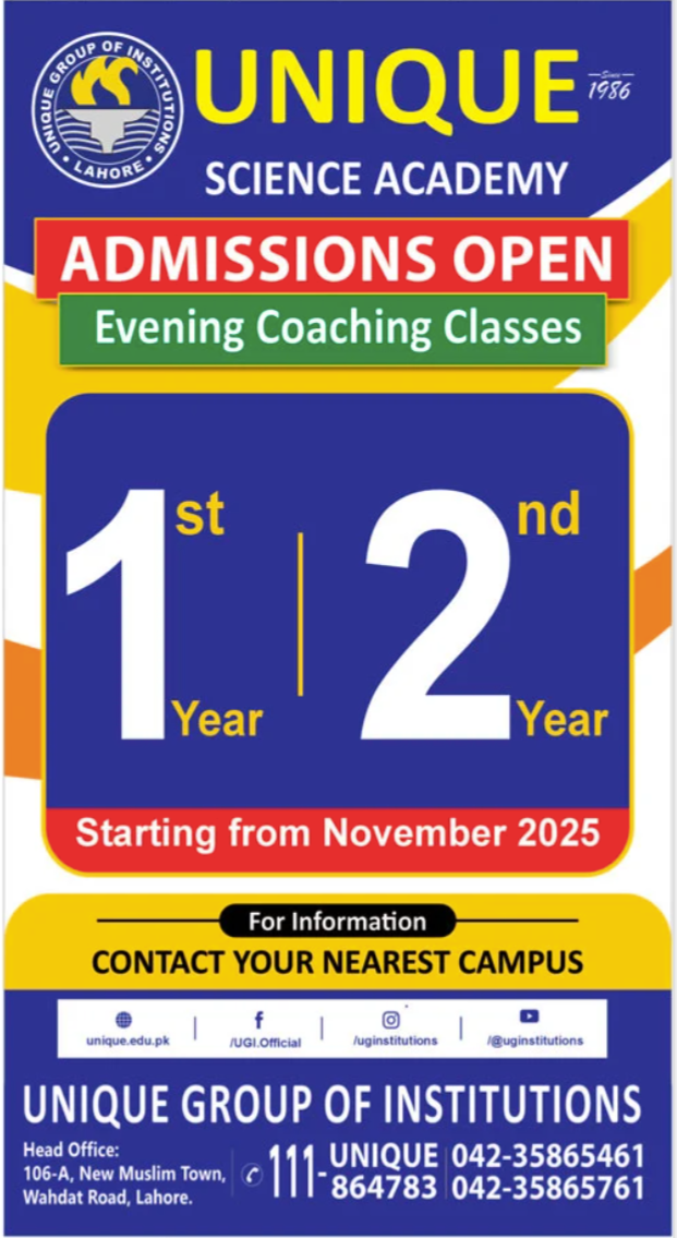Admissions in Unique Science Academy 2025 for Class 11th, 12th has been announced. Eligible students who qualify as per admission criteria in Unique Science Academy Lahore Punjab Pakistan can apply in Science College for academic year 2025. Students for admissions in & criteria can apply as per Government institute admission policy 2025 before closing date as per advertisement. Read newspaper ad for exact details.