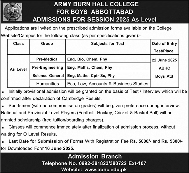 Admissions in Army Burn Hall College for Boys 2025 for 11 has been announced. Eligible students who qualify as per admission criteria in Army Burn Hall College for Boys Abbottabad Khyber Pakhtunkhwa KPK Pakistan can apply in Science College for academic year 2025. Eligible students for fulfilling criteria for admissions in can enroll as per Private admission policy 2025 till closing date. Read newspaper ad for exact details.