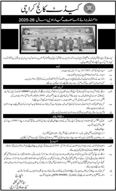 Admissions in Cadet College Karachi 2025 for 11 has been announced. Cadet College Karachi Karachi Sindh Pakistan welcomes students to apply for admissions in academic year 2025 in Science College. Students for admissions in & criteria can apply as per Private institute admission policy 2025 before closing date as per advertisement. Read newspaper ad for exact details.