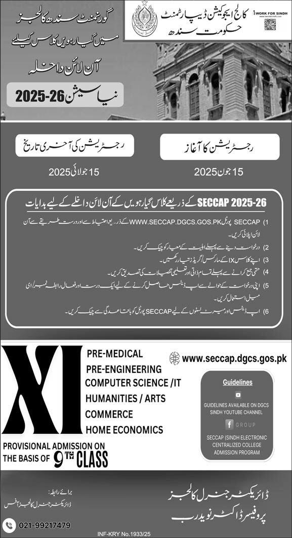 College Education Department admissions 2025 for Class 1st year has been announced. Eligible students who qualify as per admission criteria in College Education Department Karachi Sindh Pakistan can apply in Business College for academic year 2025. Students who want to enroll for academic session 2025 in qualification and admission criteria for Government institute can apply till last date. Read newspaper ad for exact details.