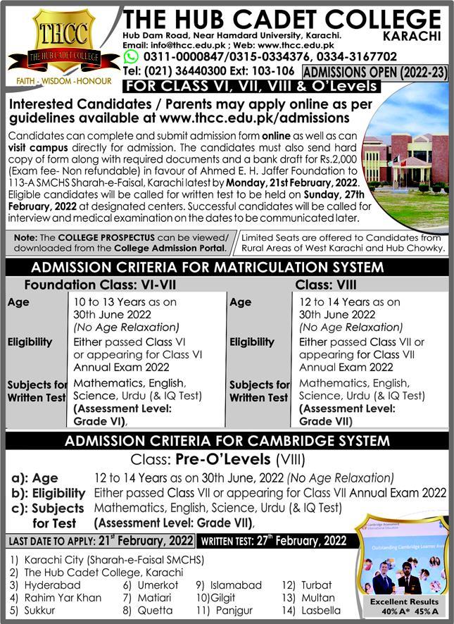 The Hub Cadet College has announced admissions 2022 for Class VI, VII, VIII and OLevels. Students can enroll for admissions in The Hub Cadet College Karachi Sindh Pakistan for academic year 2022 to continue campus based or online education in Science College. Students for admissions in Matric and Middle & criteria can apply as per Government institute admission policy 2022 before closing date February 21, 2022 as per advertisement. Read newspaper ad for exact details.