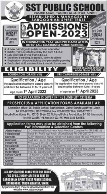 Admissions in Sargodhian Spirit Trust SST Public School Rashidabad 2022 for Class 7th, Class 8th, Class 9th, Class 10th has been announced. Eligible students can apply for academic admissions 2022 in Sargodhian Spirit Trust SST Public School Rashidabad Tando Allahyar Quetta, Multan, Abbottabad, Mianwali, Dera Ismail Khan, Sukkur, Hyderabad, Lahore, Faisalabad, Karachi and Rawalpindi Sindh Pakistan for Management School. Students for admissions in Matric and Middle & criteria can apply as per Government institute admission policy 2022 before closing date January 30, 2023 as per advertisement. Read newspaper ad for exact details.