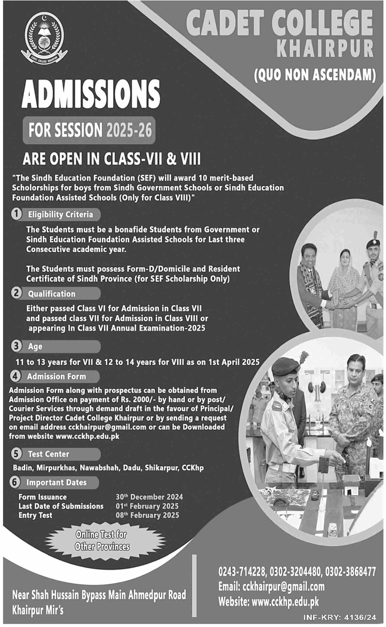Cadet College Khairpur Class 7 to 8 admissions 2025 has been announced. Students who want to take admissions in Cadet College Khairpur Khairpur Sindh Pakistan for academic year 2025 to continue education in Arts College can apply. Students for admissions in can apply for online or campus classes as per Government institute criteria till admission closing date. Read newspaper ad for exact details.