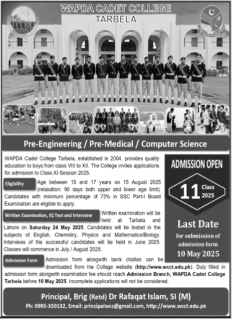Wapda Cadet College Tarbela admissions 2025 for Class 8th has been announced. Students who want to take admissions in Wapda Cadet College Tarbela Tarbela Khyber Pakhtunkhwa KPK Pakistan for academic year 2025 to continue education in Science College can apply. Students who want to enroll for academic session 2025 in qualification and admission criteria for Private institute can apply till last date. Read newspaper ad for exact details.