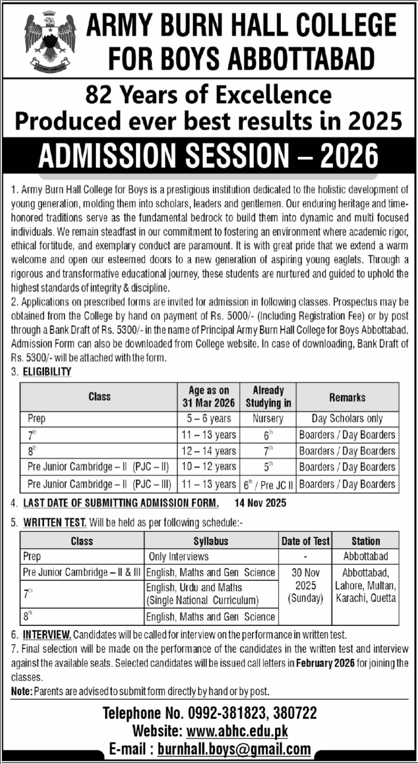 Army Burn Hall College has announced admissions 2025 for 8th. Students who want to take admissions in Army Burn Hall College Abbottabad Khyber Pakhtunkhwa KPK Pakistan for academic year 2025 to continue education in Science College can apply. Eligible candidates for admissions in can apply as per Government institute criteria and before closing date after reading advertisement online. Read newspaper ad for exact details.