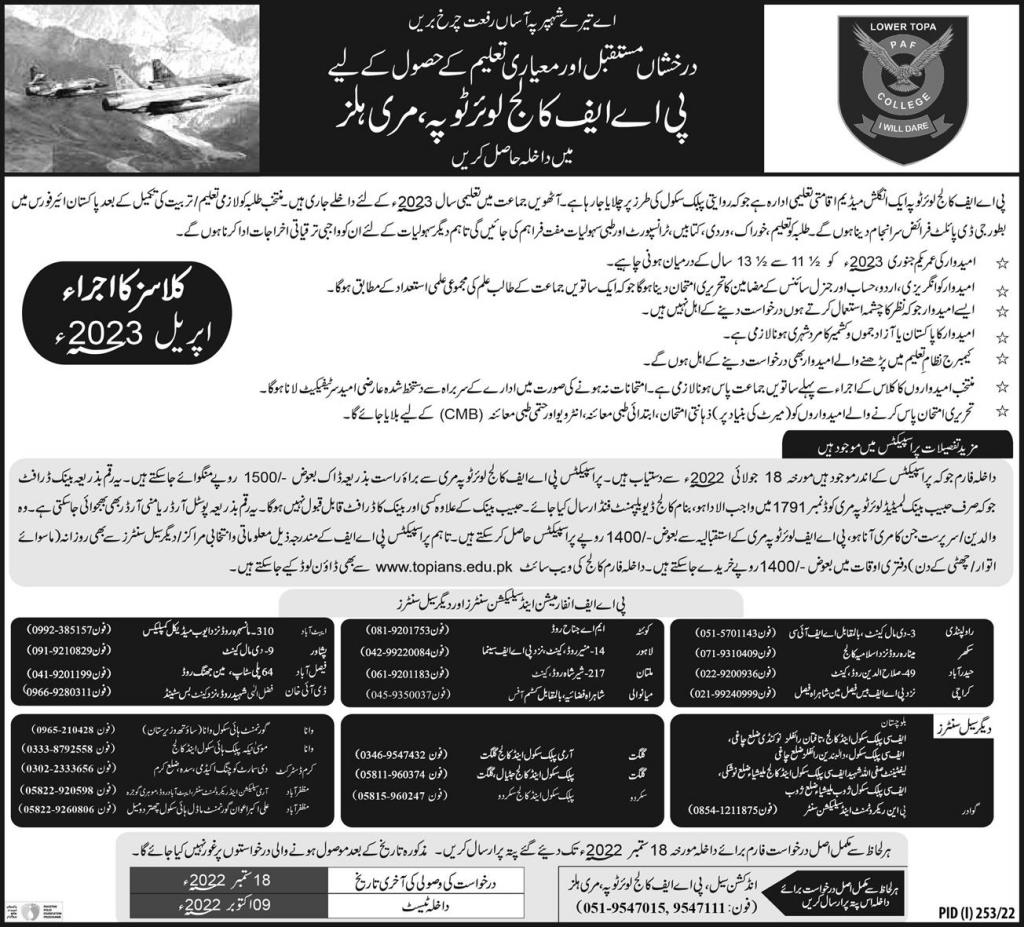 PAF College Class 8 admissions 2022 has been started. PAF College Murree Punjab Pakistan welcomes students to apply for admissions in academic year 2022 in Science College. Students for admissions in Middle & criteria can apply as per Government institute admission policy 2022 before closing date September 18, 2022 as per advertisement. Read newspaper ad for exact details.