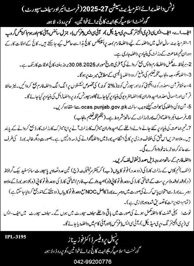 Government Islamia Graduate College For Women Class 9th, 10th admissions 2025 has been started. Eligible students can apply for academic admissions 2025 in Government Islamia Graduate College For Women Lahore Punjab Pakistan for Science College. Eligible candidates for admissions in can apply as per Government institute criteria and before closing date after reading advertisement online. Read newspaper ad for exact details.