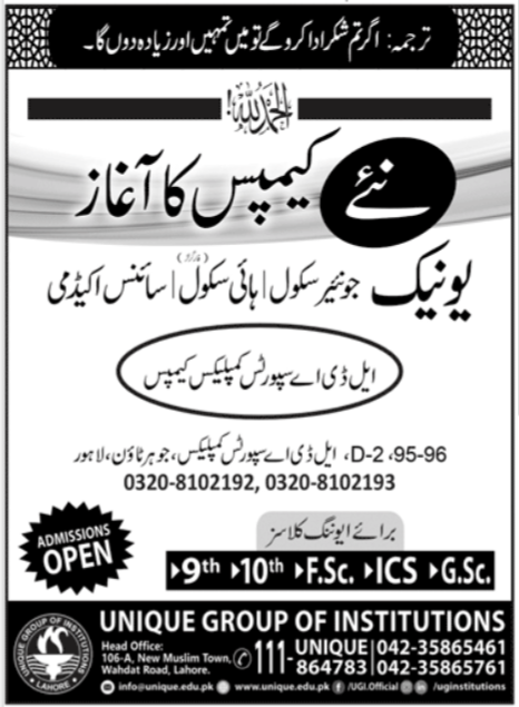 Unique Junior & High School Class 9th admissions 2025 has been started. Unique Junior & High School Lahore Punjab Pakistan welcomes students to apply for admissions in academic year 2025 in Science School. Students for admissions in & criteria can apply as per Private institute admission policy 2025 before closing date as per advertisement. Read newspaper ad for exact details.