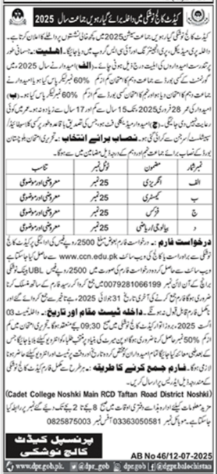 Class 9th to 10th Admissions 2025 open in Cadet College