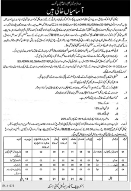 Municipal Committee invites applications for job positions advertised in daily Dunya dated 18 November 2022 for following vacancies in Daska, daska Punjab Pakistan.