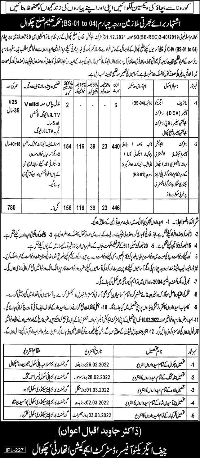 District Education Authority Chakwal Punjab Pakistan invites applications from eligible candidates for the post of Mali, Sweeper, Security Guard, Water Carrier, Lab Attendant, Naib Qasid, Chowkidar, Driver, Balawi and LTV Driver as per advertisement of January 11, 2022 published in daily Express Newspaper. Preferred Education is Middle and Primary etc.