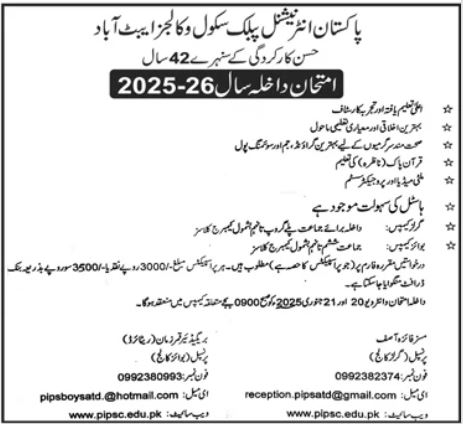 Pakistan International Public School & College has announced admissions 2025 for Class Nursery to 6th. Eligible students can apply for academic admissions 2025 in Pakistan International Public School & College Abbottabad Khyber Pakhtunkhwa KPK Pakistan for Medical College. Eligible students for fulfilling criteria for admissions in can enroll as per Private admission policy 2025 till closing date. Read newspaper ad for exact details.