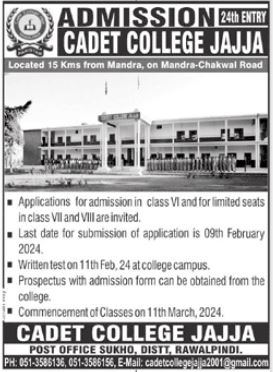 Cadet College Jajja CCJ admissions 2023 for Clases VI VII and VIII has been announced. Eligible students who qualify as per admission criteria in Cadet College Jajja CCJ Chakwal Rawalpindi Punjab Pakistan can apply in Army College for academic year 2023. Students for admissions in Middle & criteria can apply as per Government institute admission policy 2023 before closing date January 9, 2024 as per advertisement. Read newspaper ad for exact details.