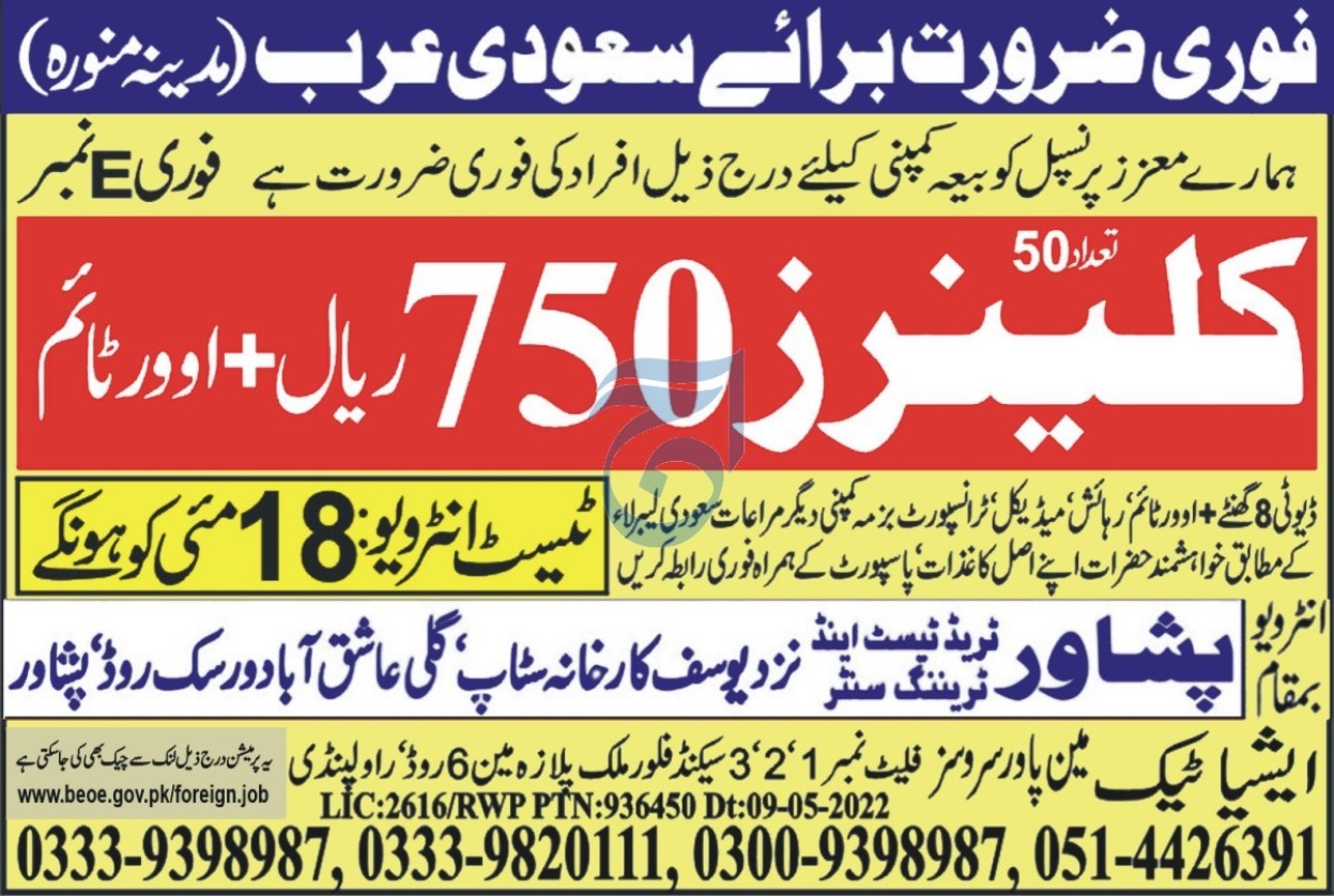 Peshawar Trade Test & Technical Training Center is looking for candidates for following posts as per job advertisement published in daily Aaj Newspaper of May 15, 2022 for location Madina, madina Saudi Arabia: