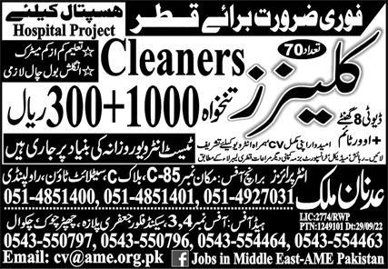 Adnan Malik Enterprises Qatar, qatar Qatar invites applications from eligible candidates for the post of cleaner as per advertisement of December 14, 2022 published in daily Express Newspaper. Educational qualifications required Matric and Middle etc.