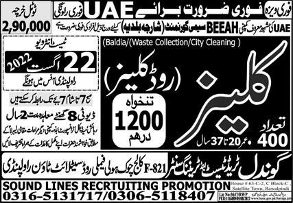 Sound Lines Recruiting Promotion jobs advertisement dated about 20 August 2022 in daily Express Newspaper invites application for the vacant post of cleaner and road cleaner in Sharjah, abu dhabi UAE. Matric and Middle etc. educational qualification will be preferred.