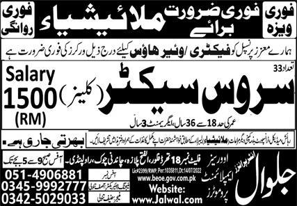 Jalwal Enterprises jobs advertisement dated about 16 July 2022 in daily Express Newspaper invites application for the vacant post of cleaner, service sector and worker in Malaysia, malaysia Malaysia. Preferred Education is Middle and Matric etc.