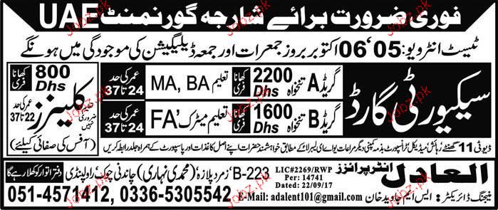 Cleaners and Security Guards are required in UAE. Food, Medical and Residence will be provided by the Company. Test and Interview will be held on 05 October 2017.