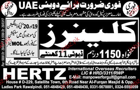 Cleaners are required in Dubai. Hertz International Overseas Recruiters. Test and Interview will be conducted under the presence of delegation on 19 and 20 May 2017.