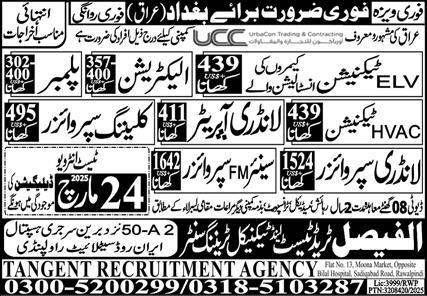 Tangent Recruiting Agency is looking for candidates for following posts as per job advertisement published in daily Express Newspaper of March 21, 2025 for location Baghdad, basra Iraq: