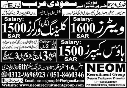 Vacant posts including house keeper, kitchen worker, waiter and cleaning worker are announced in NEOM Recruitment Group Dammam, jeddah Saudi Arabia as per 28 February 2025 advertisement in daily Express Newspaper. Matric and Intermediate etc. educational qualification will be preferred.