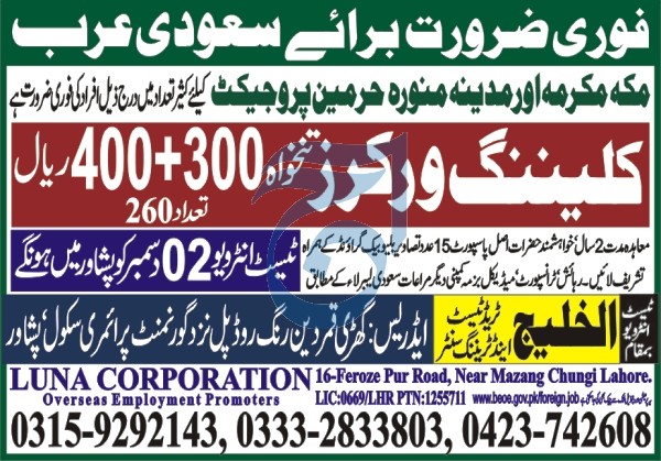Vacant posts including cleaning worker are announced in Luna Corporation Saudi Arabia, saudi arabia Saudi Arabia as per 21 November 2022 advertisement in daily Aaj Newspaper. Preferred Education is Primary, Matric and Middle etc.