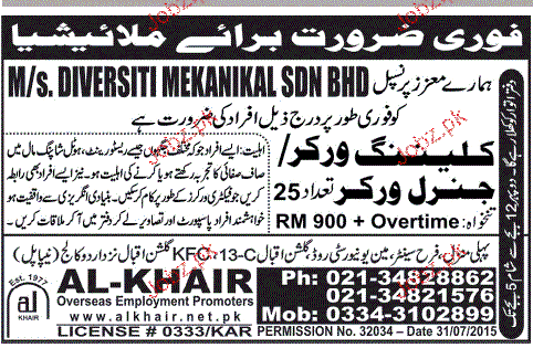 Cleaning Workers and General Workers Job Opportunity