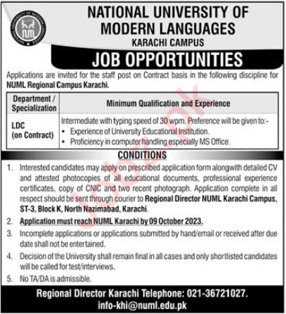 Vacant posts including lower division clerk ldc are announced in National University of Modern Languages NUML Karachi, karachi Sindh Pakistan as per 24 September 2023 advertisement in daily Jang Newspaper. Persons with Intermediate etc. education can apply.