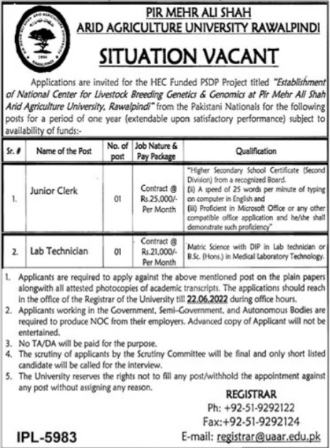 Pir Mehr Ali Shah Arid Agriculture University UAAR jobs advertisement dated about 10 June 2022 in daily Jang Newspaper invites application for the vacant post of lab technician and clerk in Rawalpindi, rawalpindi Punjab Pakistan. Persons with Intermediate and Matric etc. education can apply.