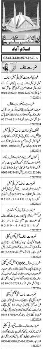 Private jobs advertisement dated about 12 December 2022 in daily Dunya Newspaper invites application for the vacant post of retired naib subedar, security supervisor, office boy, retired havaldar, retired government staff, computer call operator, male female staff, bawarchi, clerk, retired driver, cook, retired naik, management staff, security guard, accountant, retired subedar, office staff, retired subedar major, other staff, helper, manager, retired khateeb and bike rider in Islamabad, islamabad Islamabad Pakistan. Bachelor, Matric, Middle, Intermediate and Master etc. educational qualification will be preferred.