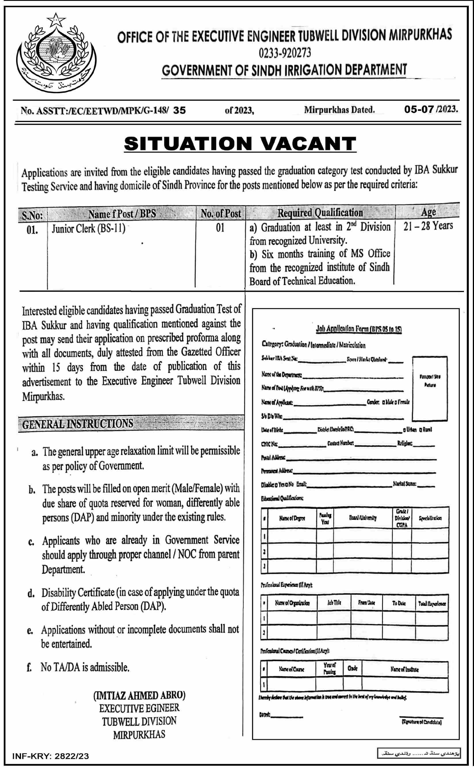 Irrigation Department jobs advertisement dated about 7 July 2023 in daily Dawn Newspaper invites application for the vacant post of clerk in Mirpur Khas, mirpur khas Sindh Pakistan. Educational qualifications required Bachelor etc.