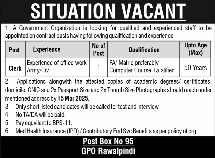 Clerk Jobs 2025 In Public Sector Organization Rawalpindi