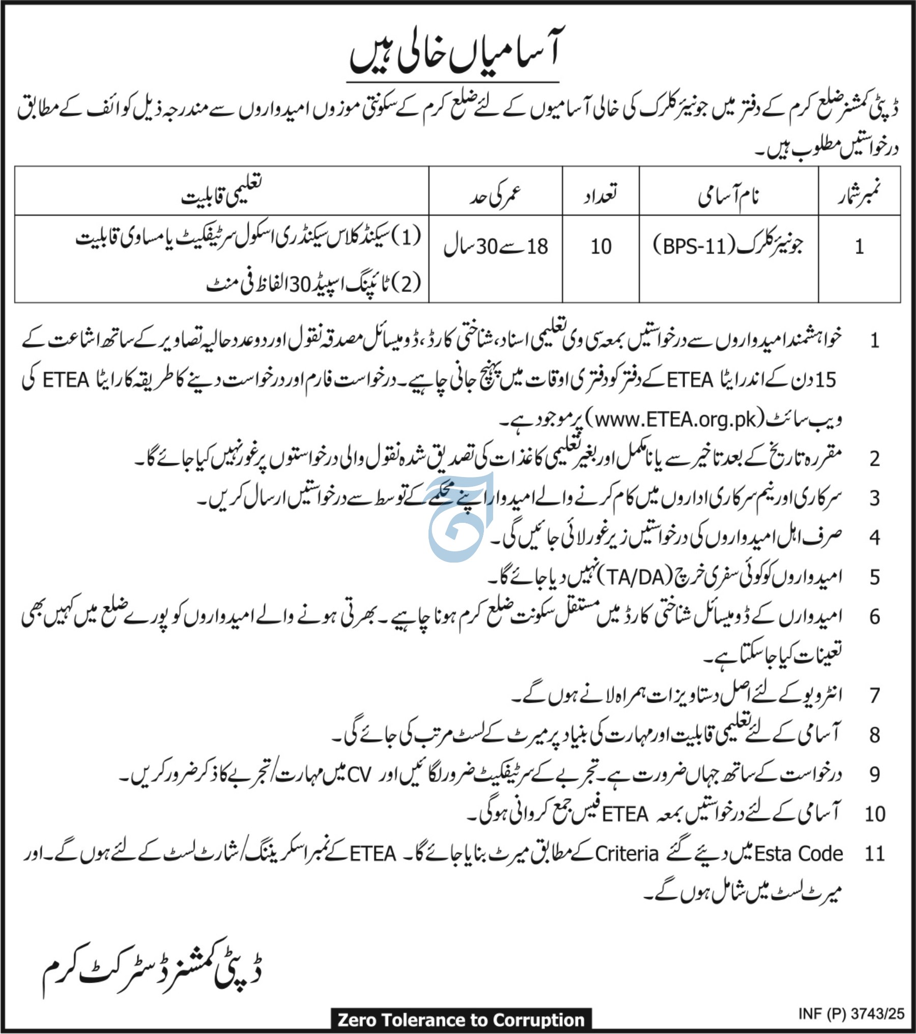 Vacant posts including clerk are announced in Deputy Commissioner Office Kurram, kurram Khyber Pakhtunkhwa KPK Pakistan as per 31 August 2025 advertisement in daily Aaj Newspaper. Educational qualifications required Matric etc.