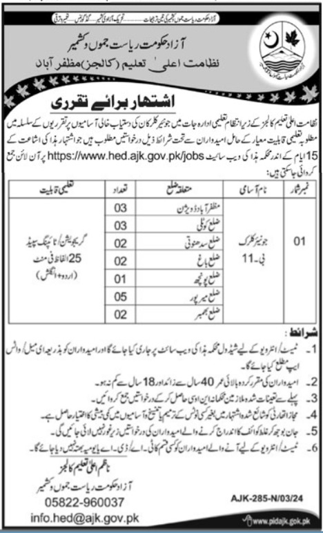 Directorate of Education Colleges Muzaffarabad, mirpur, bagh, bhimber, muzaffarabad, poonch and kotli AJK Pakistan invites applications from eligible candidates for the post of clerk as per advertisement of March 5, 2024 published in daily Ausaf Newspaper. Bachelor etc. educational qualification will be preferred.