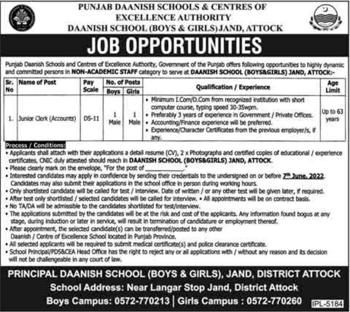 Vacant posts including clerk are announced in Punjab Daanish Schools & Center Of Excellence Authority Attock, attock Punjab Pakistan as per 20 May 2022 advertisement in daily Dunya Newspaper. Educational qualifications required I.com etc.