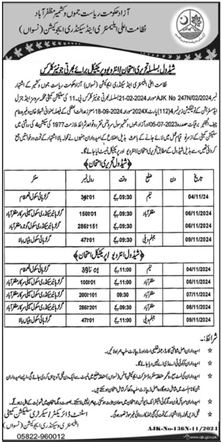 Elementary and Secondary Education Department ESED invites applications for job positions advertised in daily Khabrain dated 2 November 2024 for following vacancies in Muzaffarabad, muzaffarabad AJK Pakistan.
