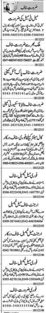 Computer Operator, Helper, Office Boy, Receptionist, HR Officer, Receptionist, Field Staff, Female Staff, Male Staff, Office Staff, Call Operator, Clerk, Security Staff, Security Supervisor, Cook, Naib Qasid, Khateeb, Laundry Man, Canteen Contractor required for private company in Lahore.