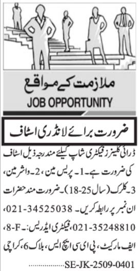 Factory is looking for candidates for following posts as per job advertisement published in daily Jang Newspaper of September 27, 2025 for location PECHS Block 6 Karachi, karachi Sindh Pakistan: