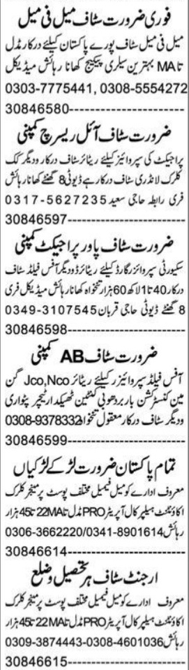 Vacant posts including manager, patwari, accountant, laundry staff, cook, teacher, helper, gun man, pro, retired nco, barber, jco, office field supervisor, female staff, public relations officer, laundry contractor, construction contractor, call operator, security supervisor guard, male staff, clerk, supervisor and office field staff are announced in Private Company Multan, multan Punjab Pakistan as per 22 March 2023 advertisement in daily Express Newspaper. Candidates with Middle, Intermediate, Master, Matric and Bachelor etc. educational background will be preferred.