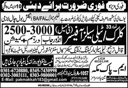 M Pak Makkah Manpower Services Dubai invites applications from eligible candidates for the post of telesales officer and clerk as per advertisement of June 15, 2022 published in daily Express Newspaper. Intermediate, Matric and Bachelor etc. educational qualification will be preferred.