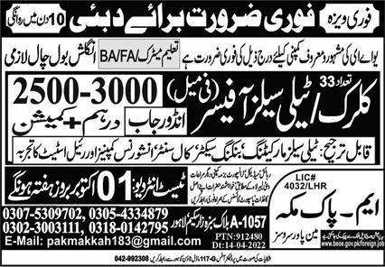 M Pak Makkah Manpower Services jobs advertisement dated about 28 September 2022 in daily Express Newspaper invites application for the vacant post of clerk and telesales officer in Dubai, sharjah Dubai. Intermediate, Matric and Bachelor etc. educational qualification will be preferred.