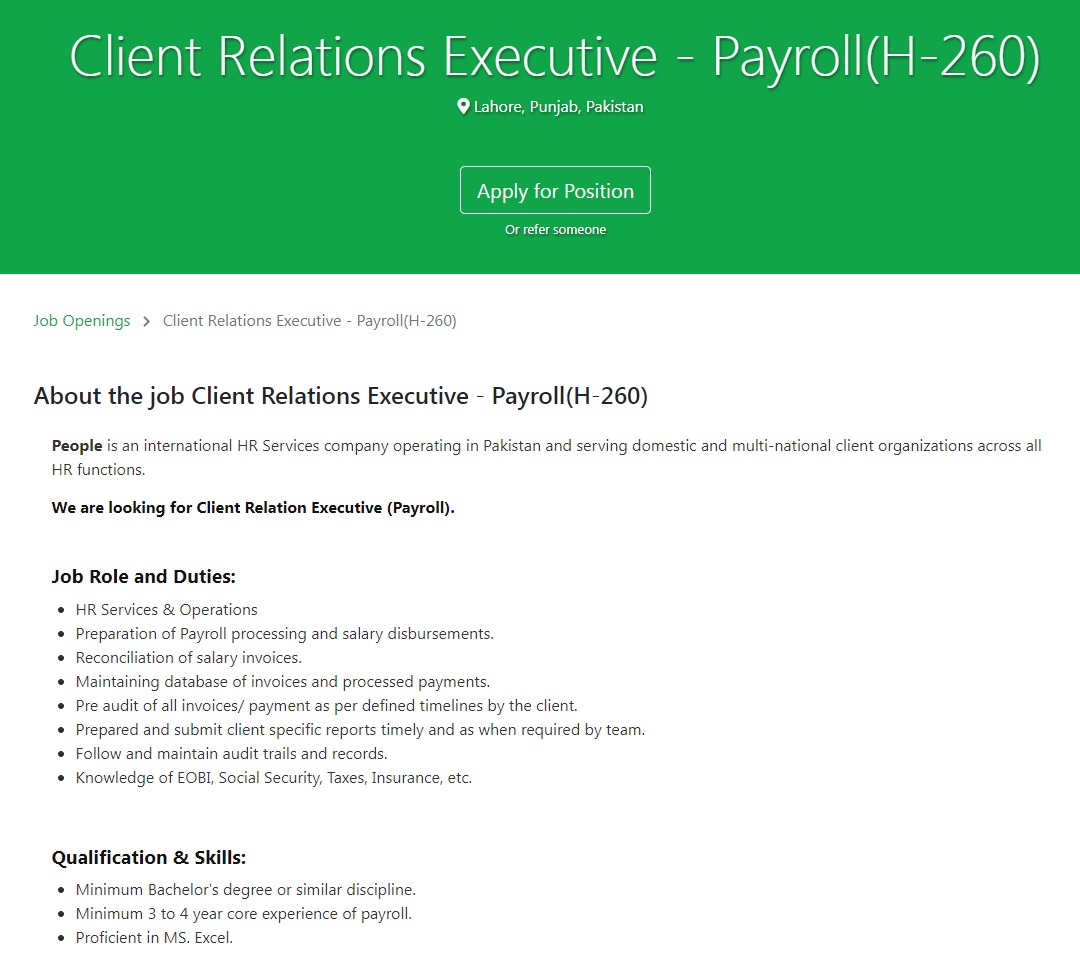 Vacant posts including client relations executive are announced in Professional Employers Private Limited Lahore, lahore Punjab Pakistan as per 6 January 2024 advertisement in daily Other Newspaper. Preferred Education is Bachelor etc.
