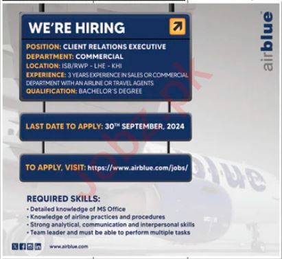 Vacant posts including client relations executive are announced in Airblue Lahore, lahore, rawalpindi, islamabad and karachi Punjab Pakistan as per 15 September 2024 advertisement in daily Jang Newspaper. Preferred Education is Bachelor and Master etc.