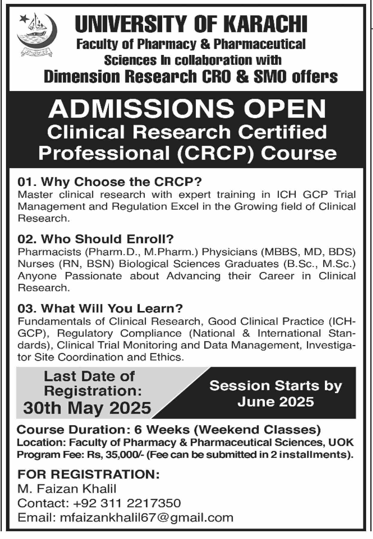 Clinical Research Certified Professional Course Admissions 2025 open in UOK