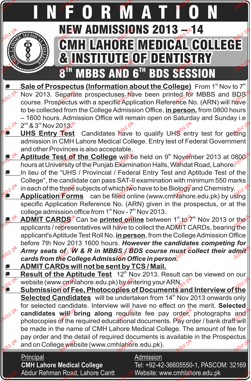CMH Lahore Medical College & Institute of Dentistry Admission in MBBS and BDS in Lahore Read newspaper ad for exact details.