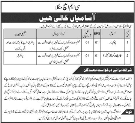Combined Military Hospital CMH jobs advertisement dated about 24 April 2022 in daily Jang Newspaper invites application for the vacant post of sanitary worker and chowkidar in Mangla, mangla Punjab Pakistan. Educational qualifications required Primary etc.