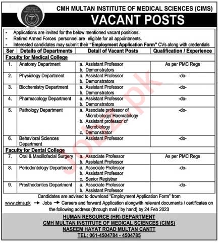 Apply at CMH Multan Institute of Medical Sciences CIMS latest Government jobs in Medical and departments before closing date which is around February 24, 2023 or as per closing date in newspaper ad. Read complete ad online to know how to apply on latest CMH Multan Institute of Medical Sciences CIMS job opportunities.
