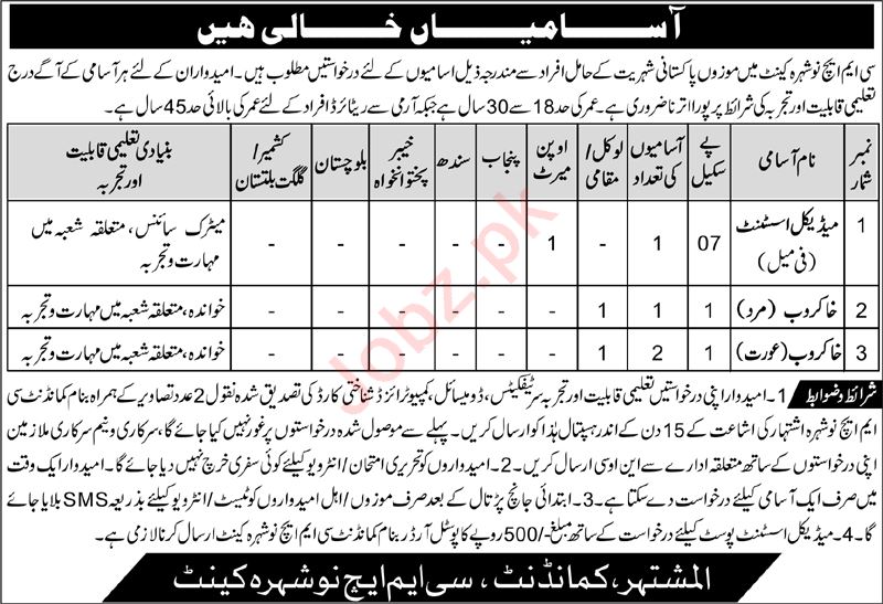 Vacant posts including medical assistant, khakroob, sweeper and sanitary worker are announced in Combined Military Hospital CMH Nowshera, nowshera Khyber Pakhtunkhwa KPK Pakistan as per 16 October 2022 advertisement in daily Other Newspaper. Candidates with Primary, Matric and Middle etc. educational background will be preferred.
