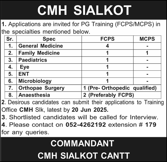 Combined Military Hospital CMH jobs advertisement dated about 14 June 2025 in daily Nation Newspaper invites application for the vacant post of fcps trainee eye, fcps trainee microbiology, fcps trainee orthopedic surgery, fcps trainee, fcps trainee paediatrics, fcps trainee anaesthesia, mcps trainee, fcps trainee ent, fcps trainee general medicine and fcps trainee family medicine in Cantt Sialkot, sialkot Punjab Pakistan. Educational qualifications required MBBS and Others etc.