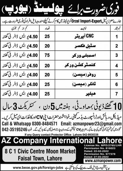 AZ Company International Warsaw, warsaw Poland invites applications from eligible candidates for the post of construction worker, helper, assembly worker, mason, cnc operator, roofer, tile mason and steel fixer as per advertisement of July 18, 2022 published in daily Express Newspaper. Middle, Intermediate and Matric etc. educational qualification will be preferred.